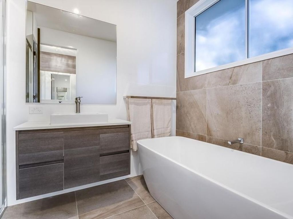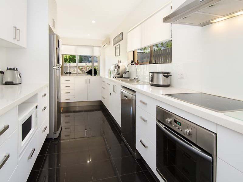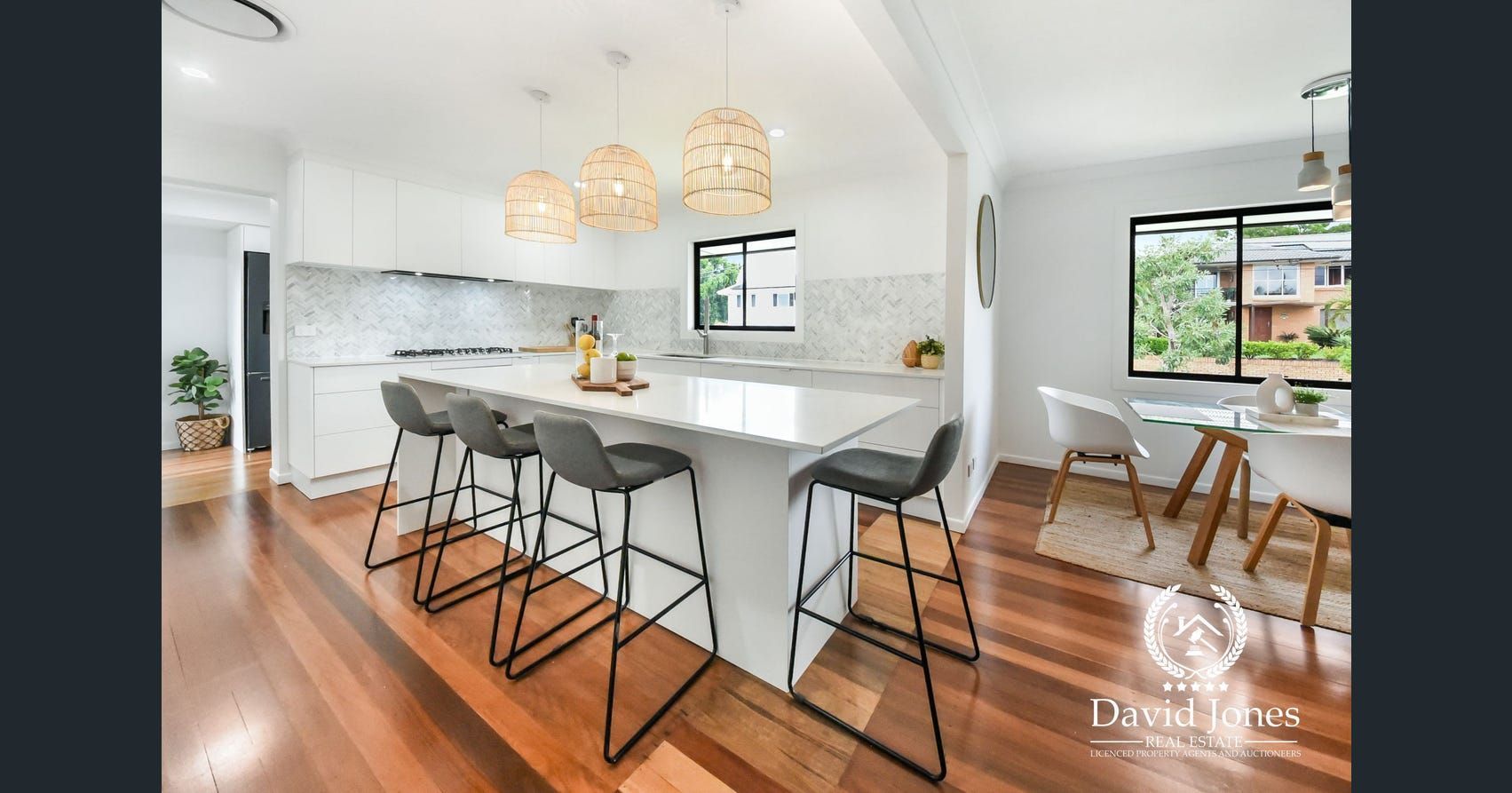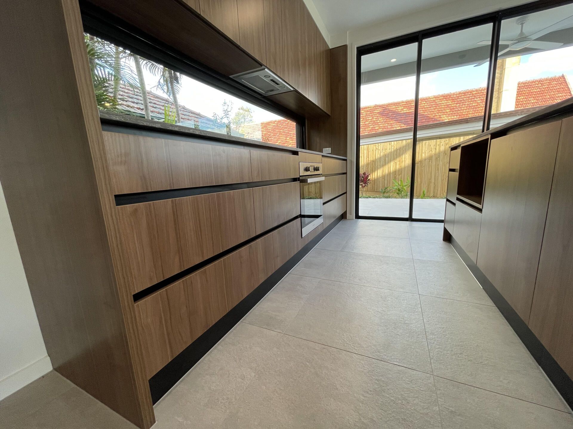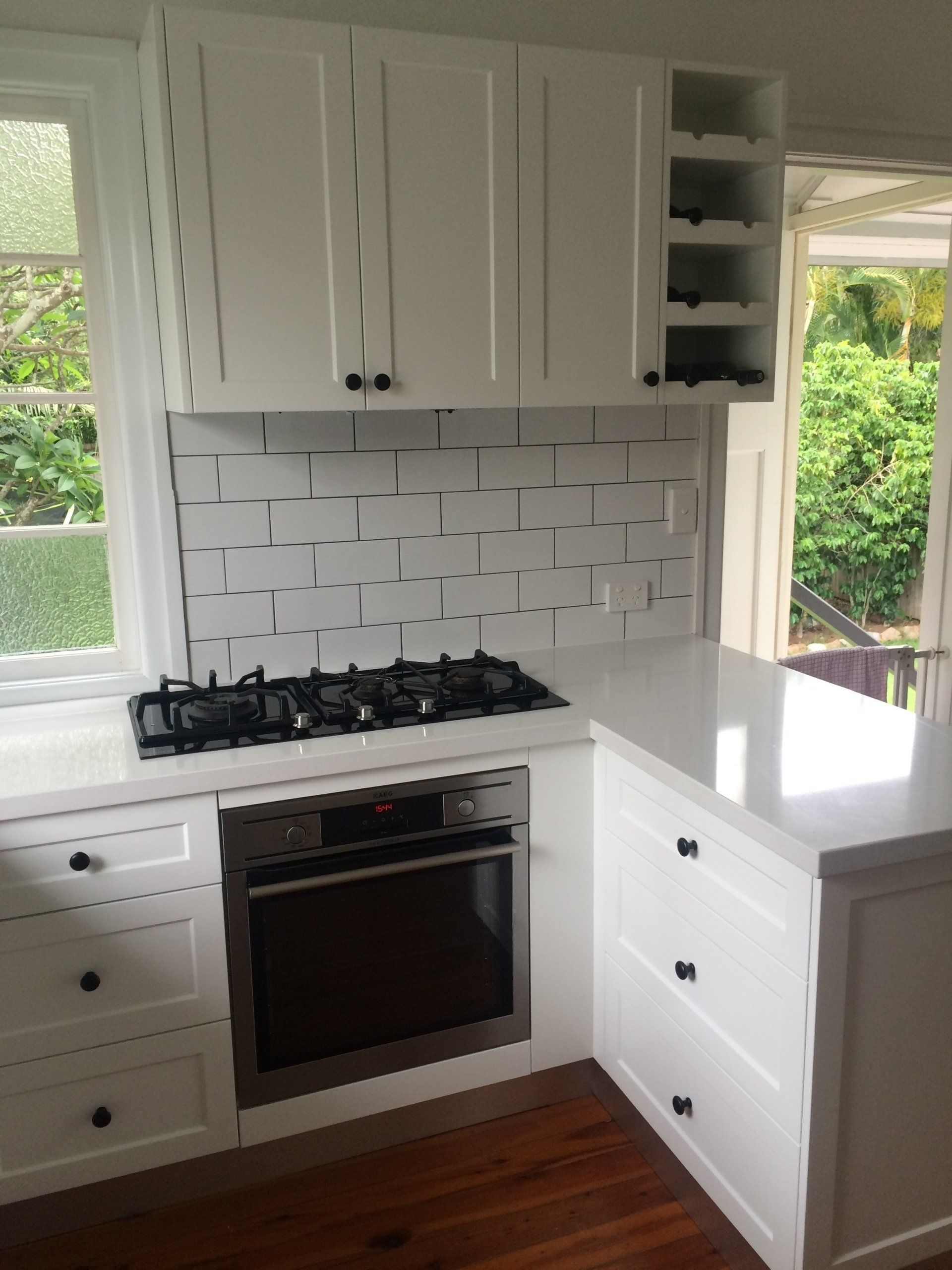 Hampton style kitchen and island bar with routed shaker style door patterns painted in a 2 Pac cool white that creates a subtle but stylish finish.