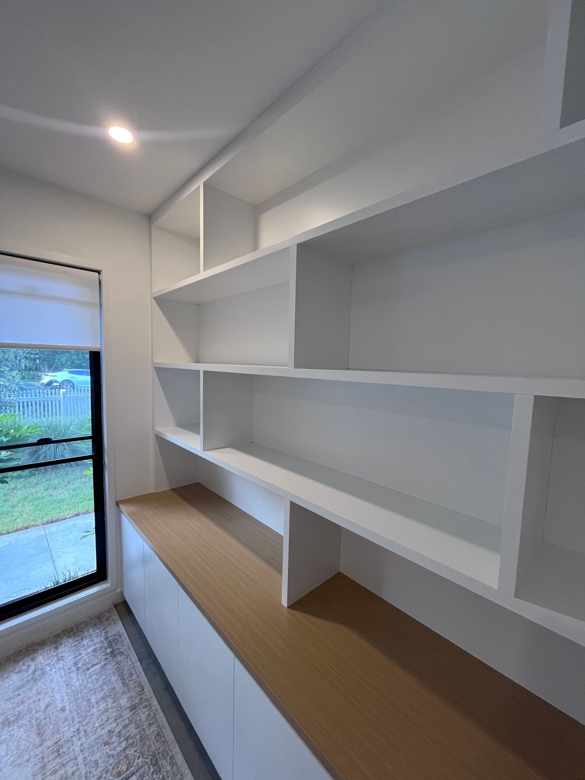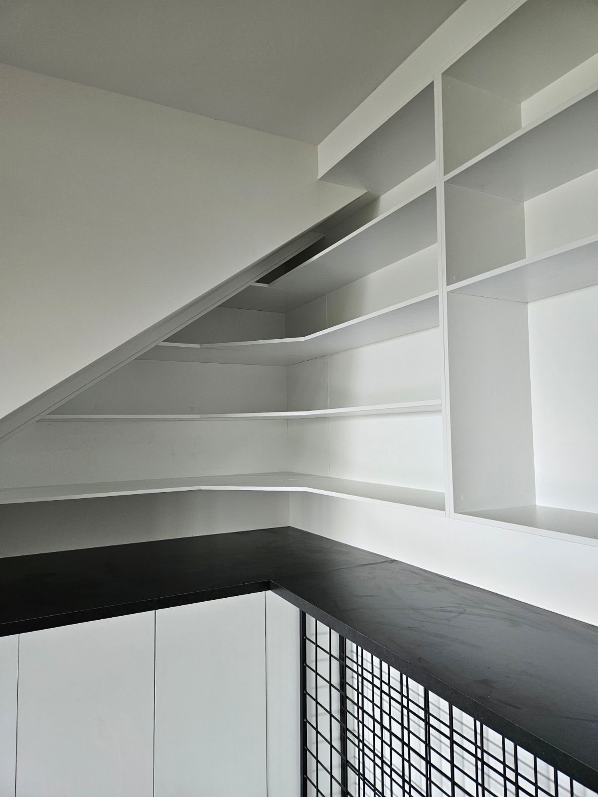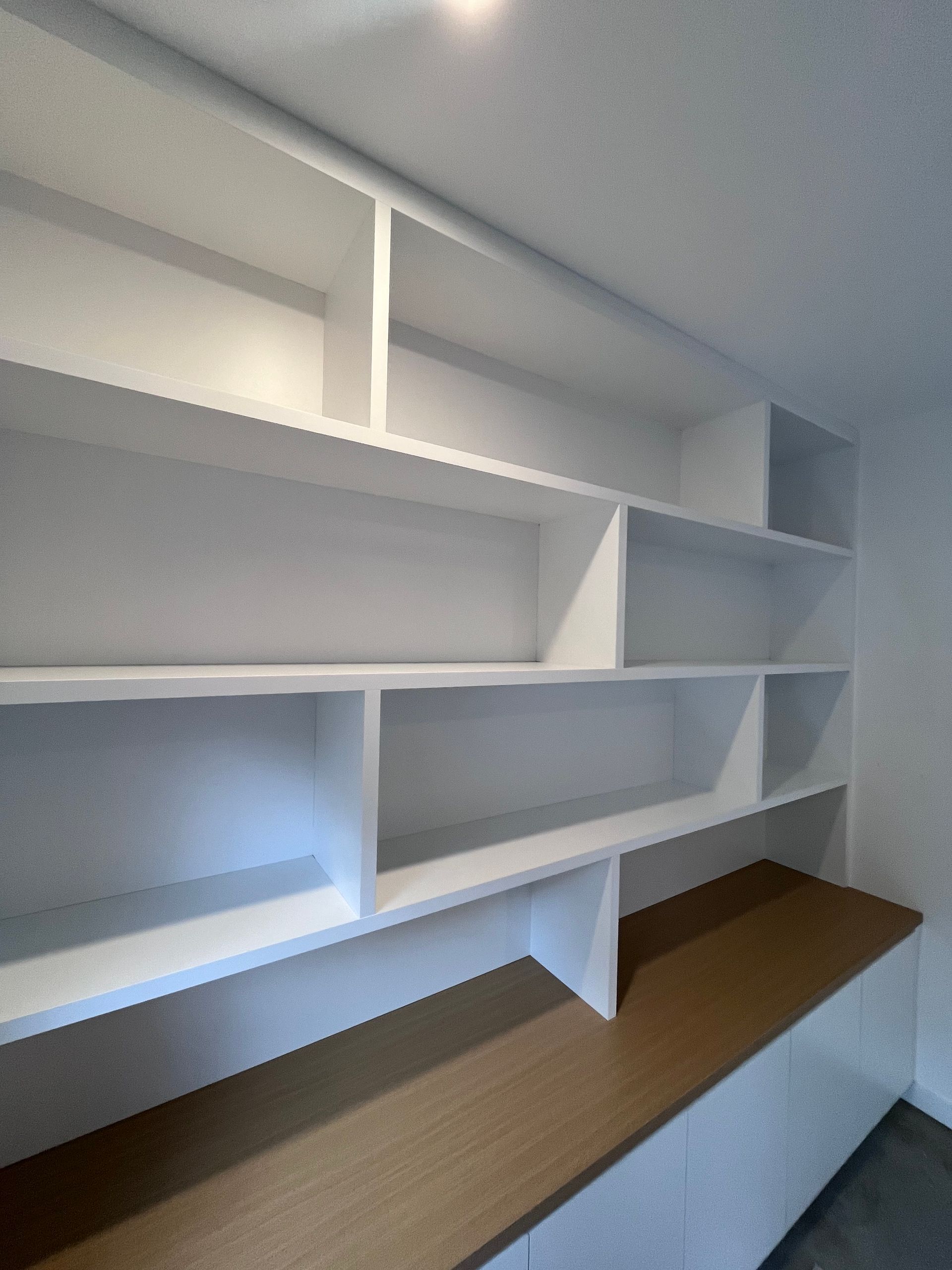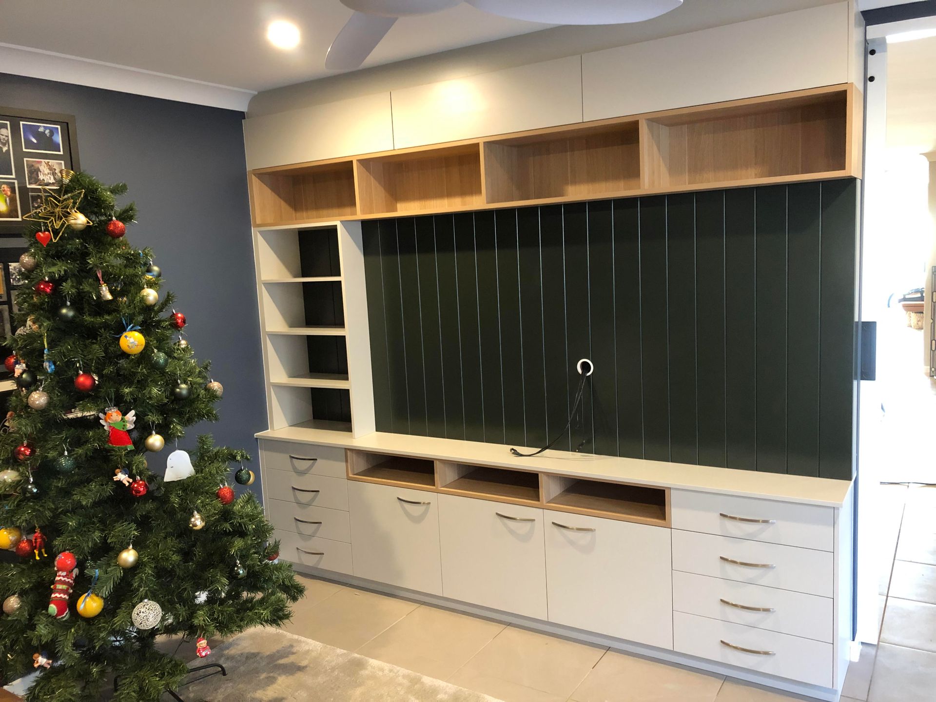 Sleek grooved VJ panels spray painted in an elegant neutral white complemented with LED lighting to showcase the workmanship.