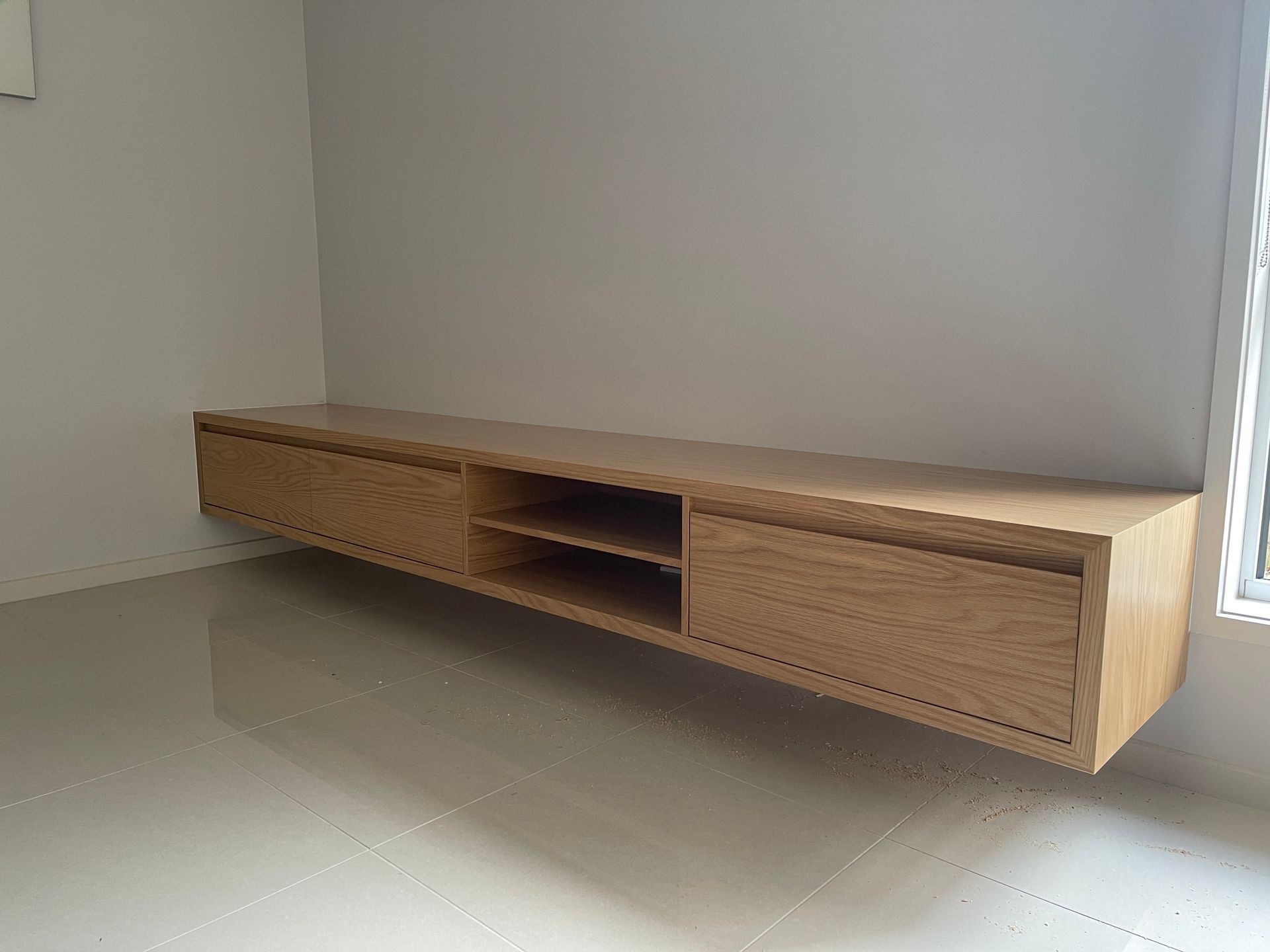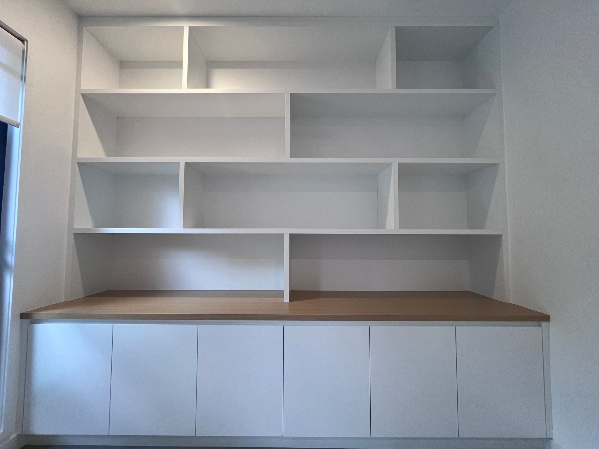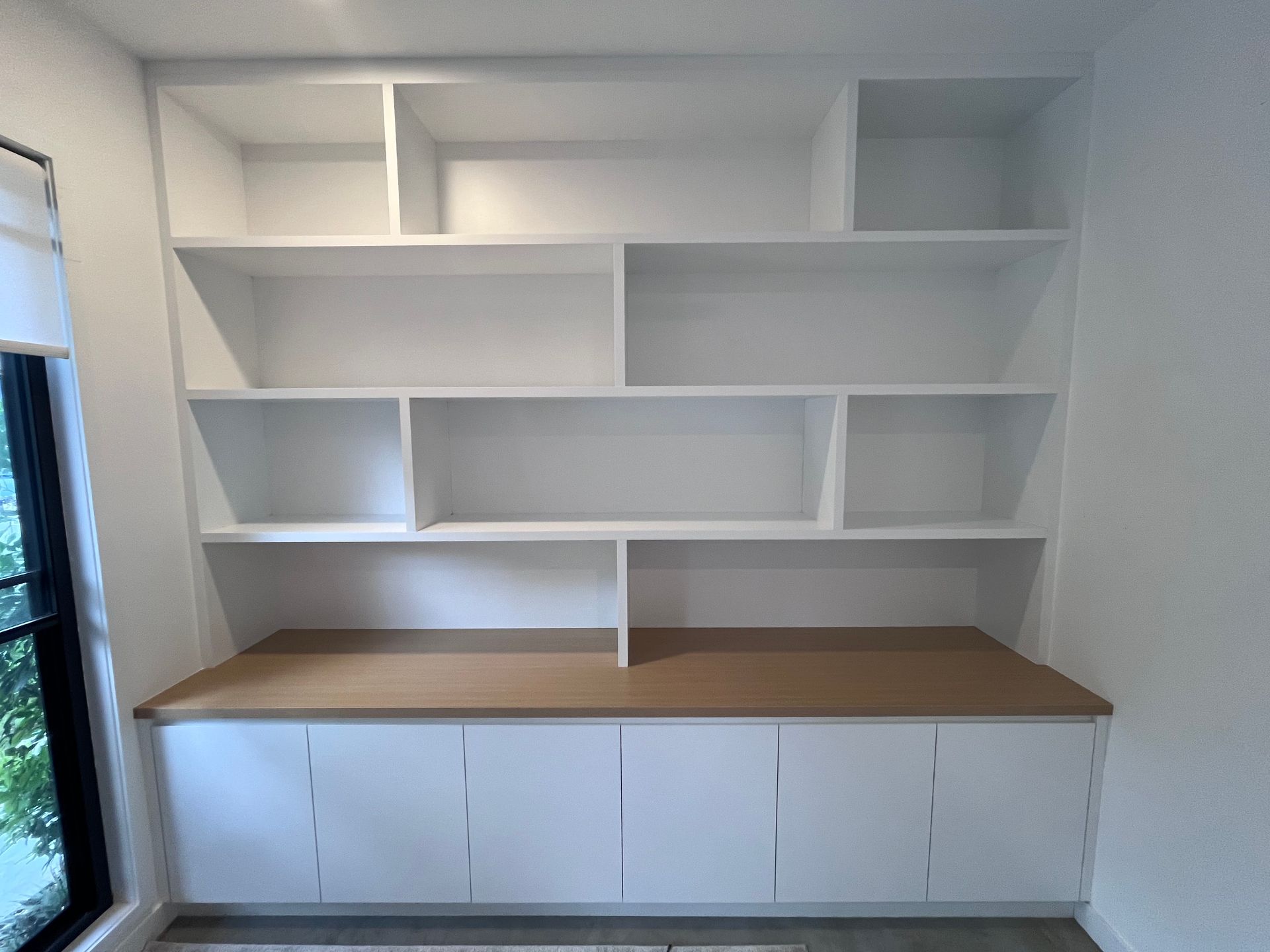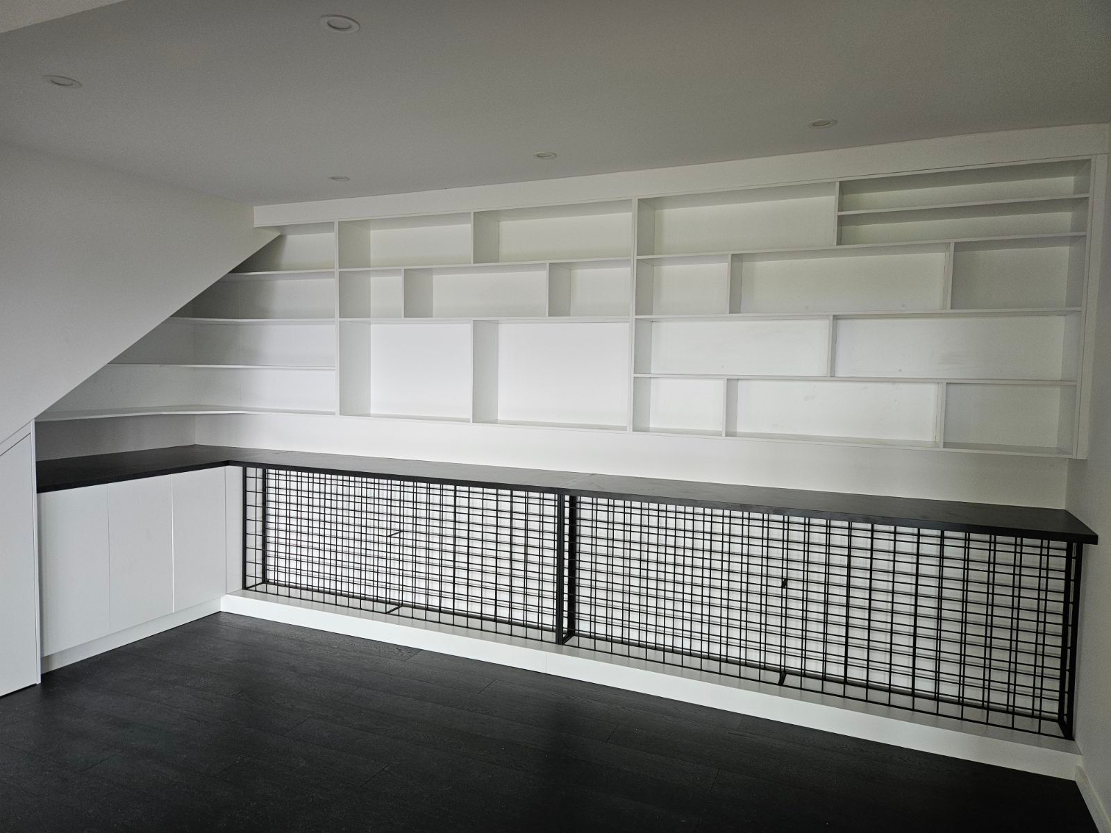 Sleek grooved VJ panels spray painted in an elegant neutral white complemented with LED lighting to showcase the workmanship.